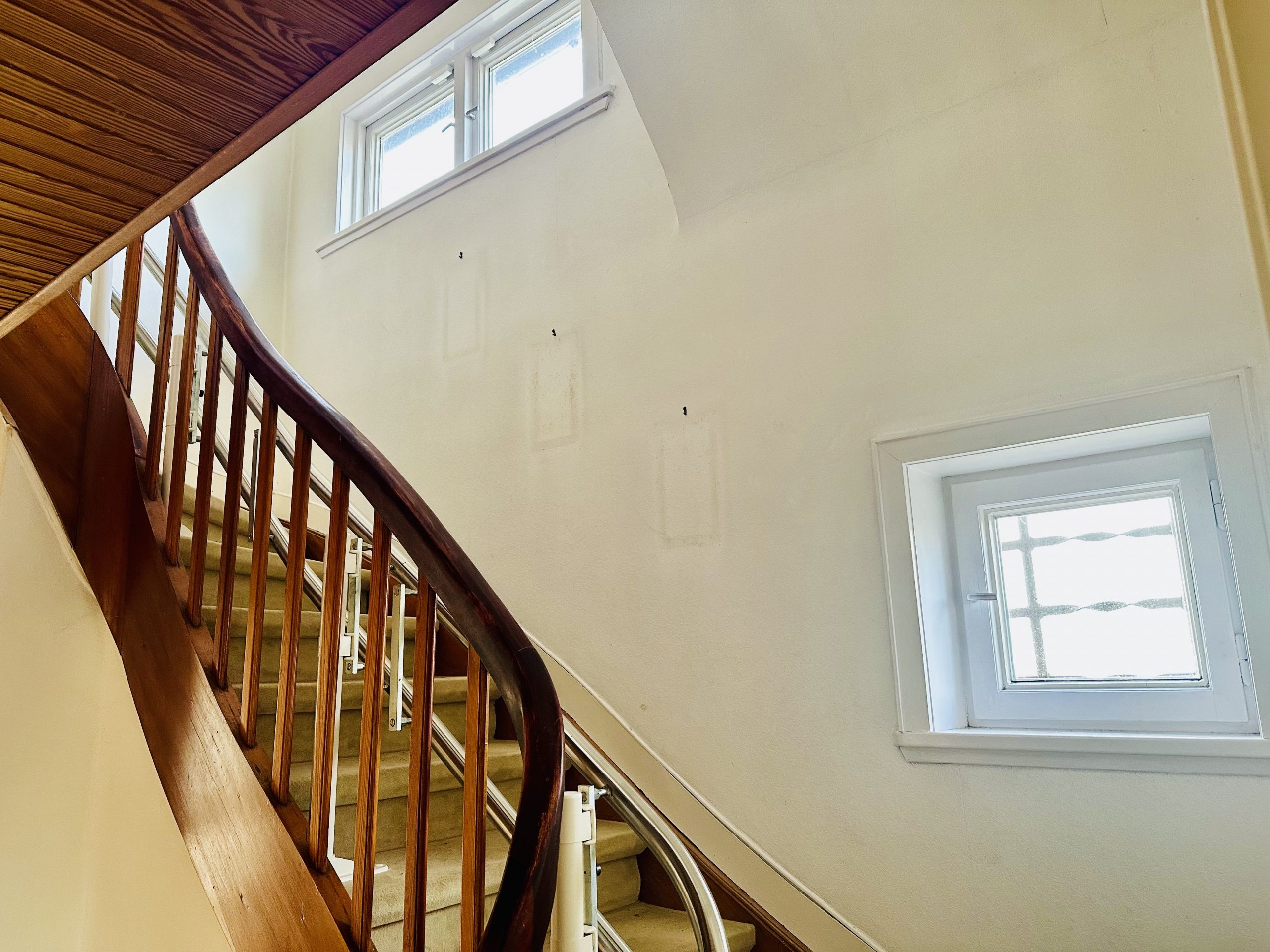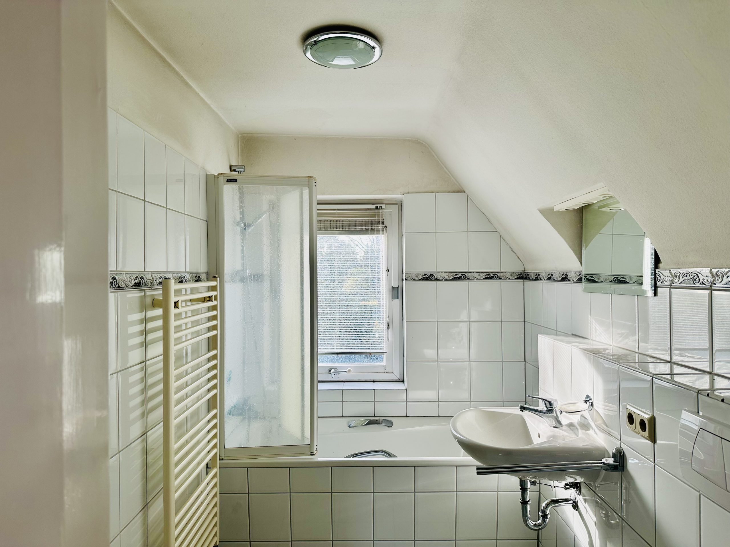 Über eine stilvolle Holztreppe gelangen Sie in das Obergeschoss. Hier befinden sich zwei Schlafzimmer und das Vollbad. Der Spitzboden bietet zusätzliche Nutzungsmöglichkeiten.