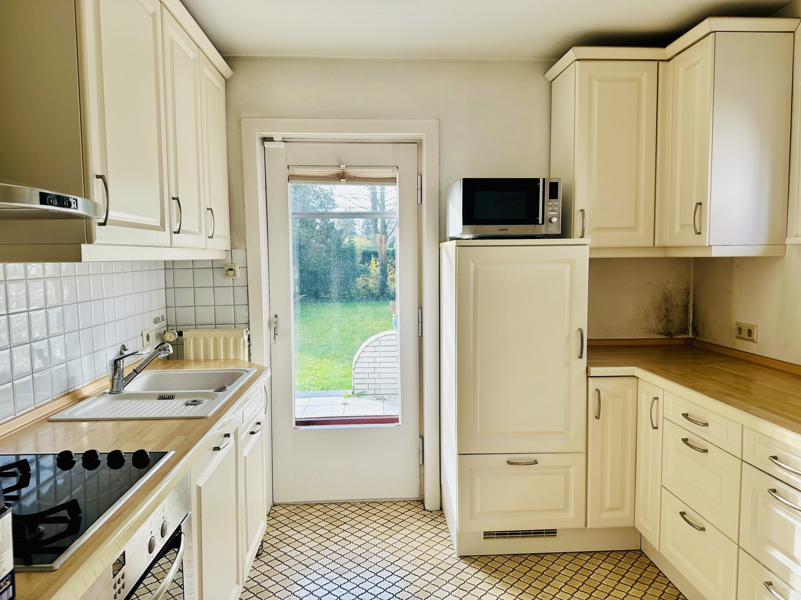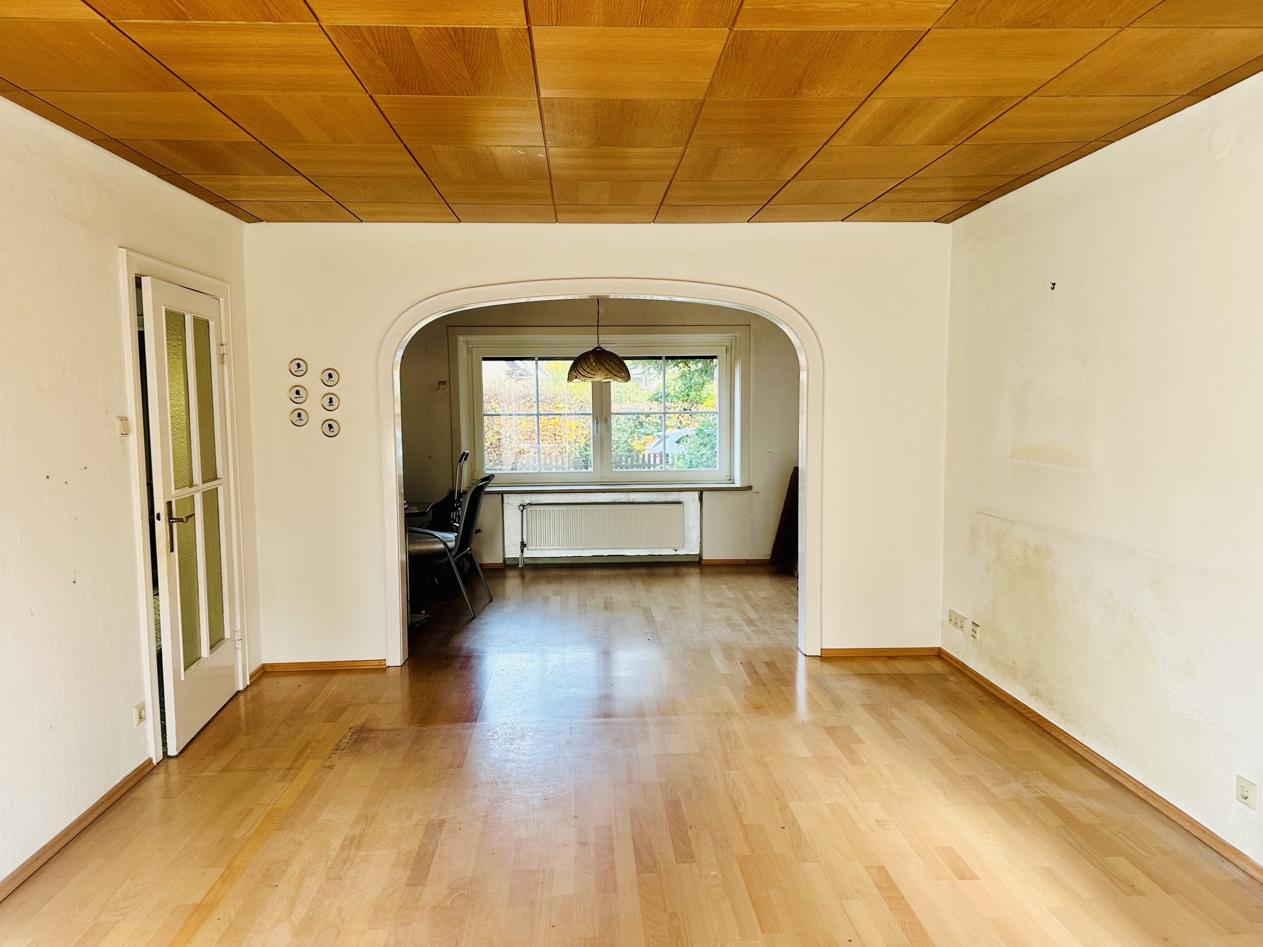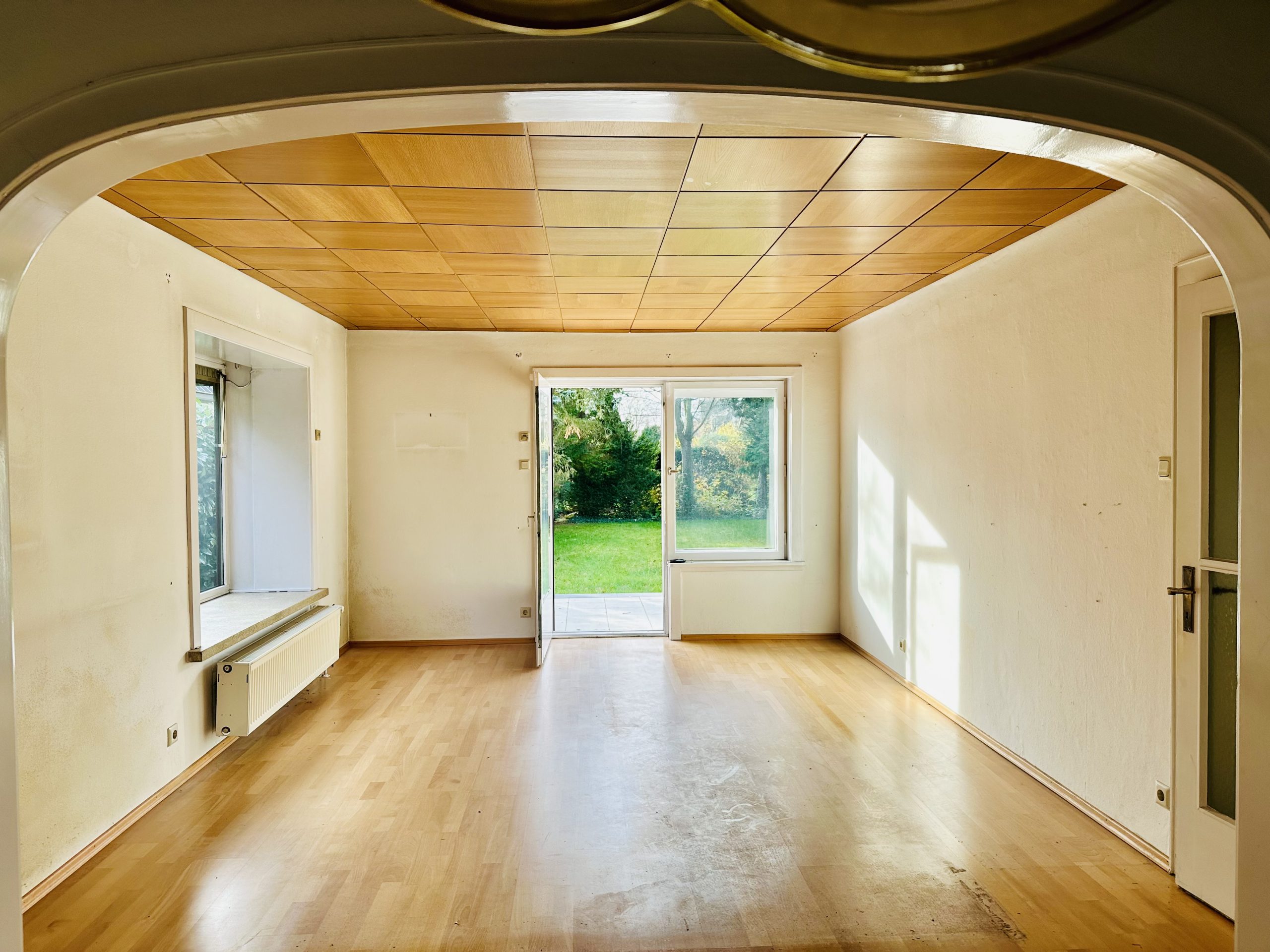 Hervorzuheben ist der schöne klassische Grundriss: Beide ineinander gehenden Wohnräume im Erdgeschoss schaffen ein offenes und großzügiges Wohngefühl. Sowohl vom Wohnbereich als auch von der angrenzenden Küche gelangen Sie auf die sonnige Terrasse mit idealer Süd-West-Ausrichtung. Die große Terrasse mit herrlichem Blick ins Grüne und dem pflegeleicht angelegten Garten schafft eine angenehme, einladende Atmosphäre. Der Erdgeschossbereich wird durch ein Gäste-WC abgerundet.